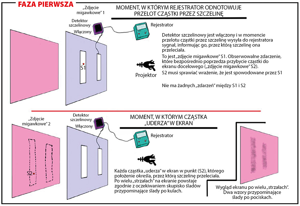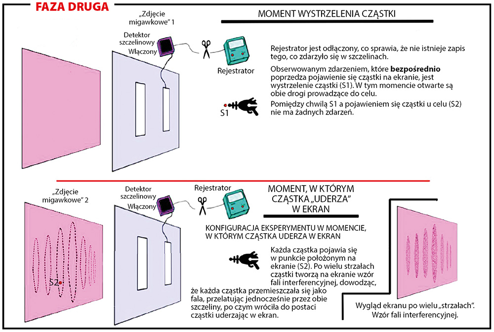 FAZA 1 (rejestrator jest podłączony do detektora szczelinowego). Zarejestrowane i zaobserwowane zdarzenie bezpośrednio poprzedzające przybycie cząstki do celu to jej chwilowe „zdjęcie” wykonane w jednej ze szczelin (S1). Zgodnie z regułą narracyjną zdarzenie (S2) musi wyglądać na ekranie tak, jakby było spowodowane przez S1. Dlatego po wielu „strzałach” rozproszone uderzenia w ekran pokazują dwa wzory przypominające ślady po kulach na tarczy strzelniczej.