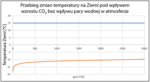 Przedstawiony na następnej stronie wykres (patrz rycina 1) ilustruje wpływ dwutlenku węgla bez udziału innych gazów. Pomarańczowa linia przedstawia wielkość ocieplenia, które wystąpiłoby, gdyby CO2 był jedynym gazem cieplarnianym oddziałującym na atmosferę. Linia niebieska obrazuje obecną średnią temperaturę na Ziemi wynoszącą 15 °C.