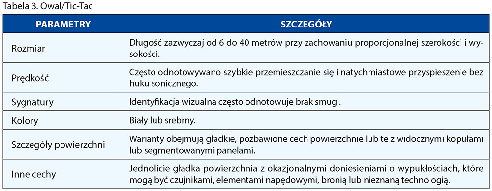 • Owal lub Tic-Tac: Owalne UAP były rzadko zgłaszane w zbiorze danych i dopiero po około roku 2003; te UAP zachowywały jednolitą „jajowatą” symetrię, a czasami były zwężone z jednej strony, przypominając łzę. Do tej kategorii należą też cylindry z wypukłymi końcami przypominające kapsułki (Tic-Tac), które czasami posiadają widoczne wypukłości na górze lub u dołu jednolitego kształtu.