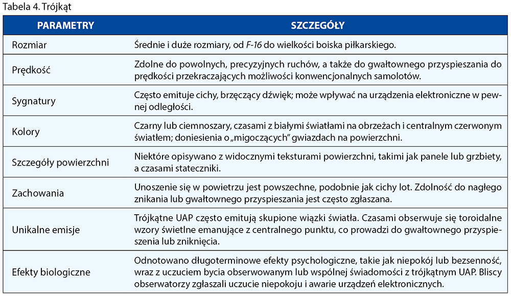 • Trójkąt: Trójkąty były jednymi z najrzadszych UAP występujących w danych. Większość z nich to trójkąty równoboczne, czasami z pionowymi „statecznikami” widocznymi na „szczycie” UAP. Zgłaszano również typy wydłużone (równoramienne), czasami również z pionowymi statecznikami.