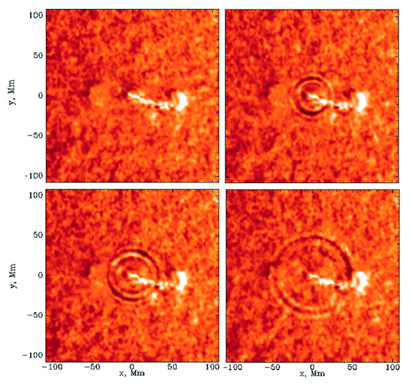 Wykryliśmy również fale rozbłysku, okrągłe pakiety fal rozchodzące się od rozbłysku i przypominające fale powstające po wrzuceniu kamyka do stawu.10