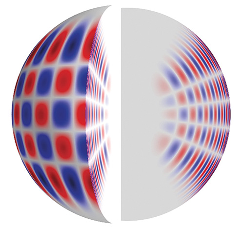 Ryc. 4 (po prawej). Oscylacje powierzchniowe na Słońcu uzyskane przez GONG. „Ilustracja słonecznego trybu ciśnienia (trybu p) o rzędzie radialnym n = 14, stopniu kątowym l = 20 i rzędzie azymutalnym m = 16. Powierzchnia pokazuje odpowiednią harmoniczną sferyczną. Wnętrze pokazuje przemieszczenie radialne obliczone przy użyciu standardowego modelu słonecznego”.11 (Grafika: Creative Commons – Warrickball)