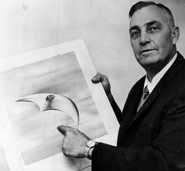 Kenneth Arnold pokazuje rysunek jednego z rzekomo widzianych przez siebie obiektów 24 czerwca 1947 roku. (Źródło: Siły Powietrzne Stanów Zjednoczonych)