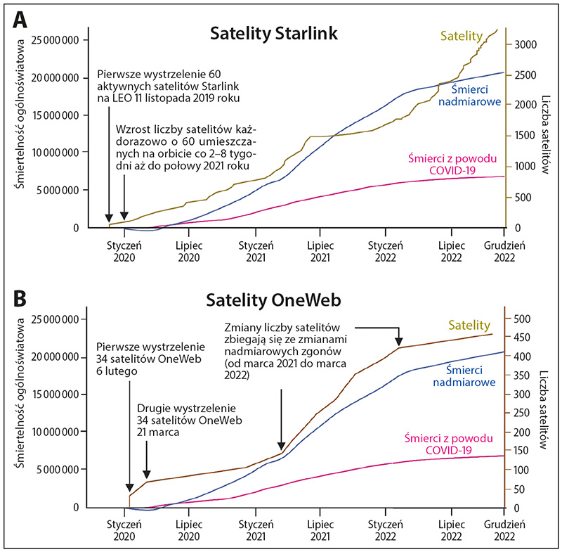 Jednak te przyczyny nie wyjaśniają tak dużej liczby nadmiarowych zgonów. Chociaż w niektórych przypadkach mogło dojść do zaniechania testowania na SARS-CoV-2, to jednak wiadomo, że w rozwiniętych krajach, gdzie nadmiarowe zgony są szczególnie wysokie, w większości testowanych zwłok niczego nie znaleziono. Co więcej, może poza kilkoma miastami w państwach, gdzie było kilka dużych fal zachorowań w pewnym momencie w trakcie pandemii, obecnie większość szpitali nie jest obłożonych do takiego stopnia, aby opóźniało to operacje i zabiegi medyczne, a mimo to nadmiarowe zgony wciąż są liczne w porównaniu z latami sprzed pandemii.1 Przeciwnie, nadmiarowe zgony stale rosną mimo postępującego spadku przypadków COVID-19.1 Znacznie bardziej alarmujące i wyraźnie podważające wszystkie proponowane wytłumaczenia skutków SARS-CoV-2 i COVID-19 jest to, że jak wspomniano wyżej, wzrost nadmiernej śmiertelności dostrzeżono tuż po wystrzeleniu pierwszych sześciu satelitów LEO OneWeb w lutym 2019 roku,5 w czasie gdy nie było SARS-CoV-2, pandemii ani lockdownów. Z pewnością coś innego powoduje te zgony.