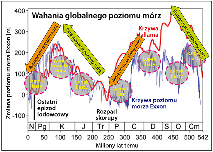 Znaczące jest to, że stałe obniżanie się poziomów mórz widoczne w środkowej części tej ryciny zbiega się precyzyjnie z odpływem starożytnych mórz kontynentalnych podczas pęknięcia i rozpadu antycznego superkontynentu Pangei około 250 milionów lat temu. Stały wzrost poziomów mórz w drugiej części tego cyklu zbiega się zarówno z przyrostem nowych wód z nowo otwierających się stref rozprzestrzeniania się grzbietów śródoceanicznych, jak i z zakłóceniem i topnieniem istniejących wcześniej starożytnych czap lodowych na biegunach w trakcie migracji kontynentów. Potem nastąpiło ponowne utworzenie się polarnej czapy lodowej nad Antarktyką i obniżenie poziomu mórz w czasie miocenu aż do teraz.