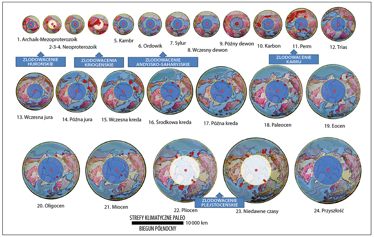 Rycina 4 ukazuje układ mórz i lądów w regionie starożytnego bieguna północnego zaznaczonym niebieskim okręgiem na każdym modelu małej Ziemi. Przedstawiony jest tam również opublikowany rozkład znanych antycznych skał i formacji lodowcowych w postaci czerwonych kropek, ponadto białym okręgiem zaznaczona jest obecność i położenie w czasie znanych czap lodowych.