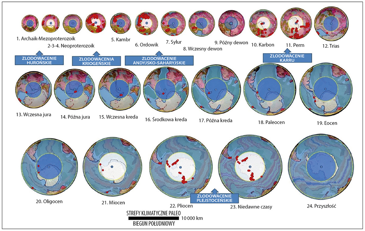 Rycina 5 przedstawia położenie regionu starożytnego bieguna południowego oraz opublikowany rozkład znanych skał i formacji lodowcowych zaznaczonych czerwonymi kropkami oraz obecność znanych czap lodowych oznaczonych białymi okręgami. Warto zauważyć, że w tamtym czasie południowe czapy lodowe – andyjsko-saharyjska i karru – koncentrowały się nad superkontynentem Gondwaną, dzięki czemu miały dobrze zachowane lądowe pokrywy lodowe, jak i związane z nimi skały i formacje lodowcowe.