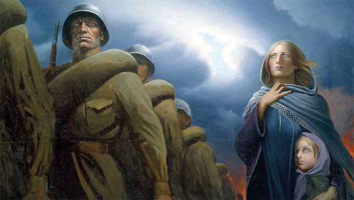 Historia się powtarza. Radziecki artysta symbolista Konstantin Wasiljew (1942–1976) namalował obraz „Pożegnanie Słowianki” zainspirowany słynną patriotyczną melodią marszową o tej samej nazwie, która została napisana na cześć słowiańskich kobiet towarzyszących mężom w pierwszej wojnie bałkańskiej. Melodia ponownie stała się popularna w Rosji i sąsiednich krajach podczas pierwszej wojny światowej i była wykonywana podczas parady 7 listopada 1941 roku na Placu Czerwonym, po której radzieccy żołnierze wyruszyli prosto do walki w bitwie o Moskwę w ramach II wojny światowej.