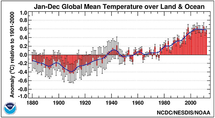 Następnie przyjrzyjmy się globalnym zmianom średniej temperatury od roku 1880 do chwili obecnej. Tutaj kilka anomalii uderza w myślący umysł. Po pierwsze, okresowi intensywnego rozwoju przemysłu w latach 1940–1977 nie towarzyszy żadne ocieplenie. W rzeczywistości w tym okresie wielu klimatologów alarmowało o zbliżaniu się epoki lodowcowej!10
