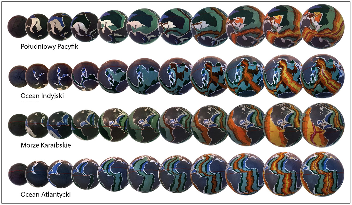 Kontynuując zmniejszanie promienia Ziemi i modelu geologicznego wstecz w czasie do okresu późnego permu – około 250 milionów lat temu – wszystkie młode wulkaniczne skorupy dna morskiego oraz większość osadów morskich leżących wzdłuż półek kontynentalnych zostają usunięte (patrz rycina 3). Rozkład opublikowanych starożytnych mórz kontynentalnych jest także zaznaczony na niebiesko.
