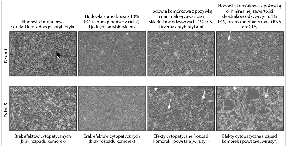 Jak widać, w piątym dniu eksperymentu wystąpił charakterystyczny CPE, „dowodzący” istnienia i patogenności wirusa, mimo iż w żadnym momencie do kultury nie dodano patogennego wirusa. Wynik ten może oznaczać jedynie to, że CPE było wynikiem sposobu przeprowadzenia eksperymentu hodowlanego, a nie działania jakiegokolwiek wirusa.