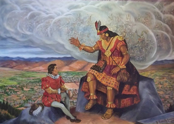 Osobliwy obraz znajdujący się w Muzeum w Cuzco przedstawiający gigantycznego inkaskiego króla rozmawiającego z Hiszpanem.