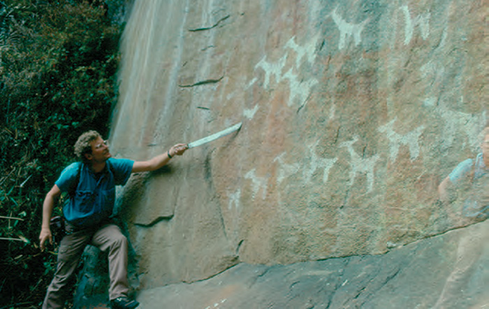 Autor artykułu pokazujący petroglify znajdujące się na wschód od Cuzco przedstawiające lamy – być może wskazujące kierunek do Paititi?