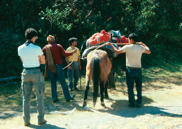 Greg Deyermenjian i członkowie wyprawy pakują ekwipunek na konia przed wyprawą do Paititi w roku 1986.