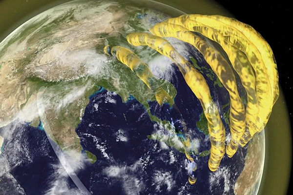 Gdy promieniowanie jonizujące ze Słońca uderza w atomy w atmosferze, nad Ziemię powstają ogromne rury plazmowe. (Grafika: Uniwersytet w Sydney)