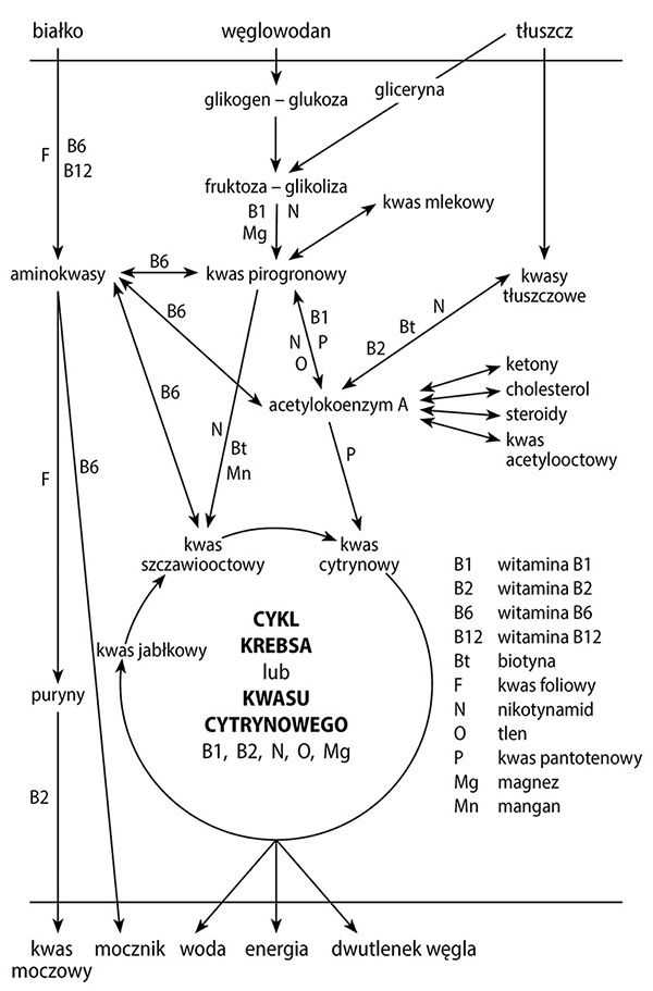 Przedstawiony na następnej stronie schemat obrazuje cykl kwasu cytrynowego. Można zauważyć, że centralną cząsteczką biochemiczną, która kieruje w cyklu podziałem składników odżywczych, jest kwas pirogronowy. Jedna cząsteczka glukozy jest podzielona na dwie cząsteczki kwasu pirogronowego, przy czym kwas pirogronowy może być przekształcony z powrotem w glukozę. Głównym problemem, który wyczerpuje naszą energię i prowadzi do naszych współczesnych chorób, jest zablokowanie konwersji kwasu pirogronowego na acetylokoenzym A. Wynika to z tego, że potrzebne utlenianie jest mniej lub bardziej zablokowane przez drobnoustroje i ich toksyny.
