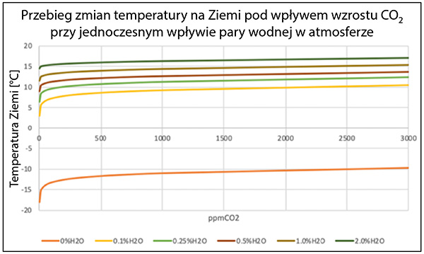 Na przedstawionym poniżej wykresie (patrz rycina 2) uwzględniono dodatkowo wpływ pary wodnej. Pomarańczowa linia obrazująca wpływ samego CO2 pozostaje na swoim miejscu.