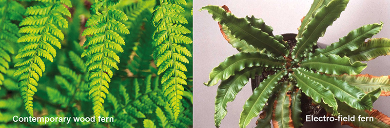 Ryc. 7. Porównanie współczesnej paproci drzewiastej (po lewej) z fenotypem powstałym po działaniu pola elektrostatycznego (po prawej). (Zdjęcie: Pixabay)