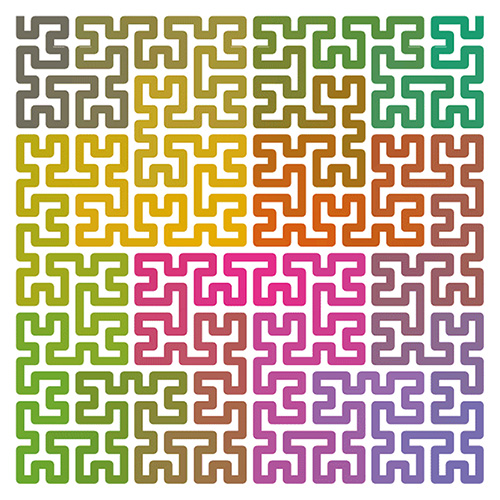 Ryc. 8. Krzywa Hilberta – ciągła fraktalna krzywa wypełniająca przestrzeń. (Źródło: Wikipedia)