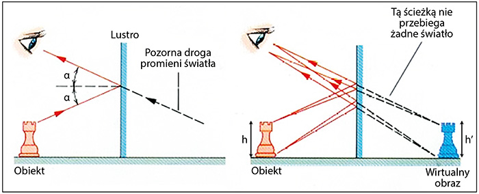 Sheldrake: Jeśli chodzi o projekcję obrazów, nie musimy nawet iść tak daleko i mówić o aurach i tym podobnych rzeczach, które tylko niektórzy ludzie widzą, a większość z nas nie. Koncepcja, że obrazy są rzutowane, pojawiła się nawet przed Bergsonem. Było to powszechne przekonanie w starożytnym świecie. Euklides, wielki matematyk żyjący w III wieku przed naszą erą, powiedział, że nasze oczy rzutują obrazy. Był pierwszą osobą, która dała klarowne wyjaśnienie działania luster, i teorię Euklidesa o rzutowanych promieniach wizualnych nadal można znaleźć w każdym podręczniku do fizyki. Gdy zajrzysz do podręcznika do fizyki, aby dowiedzieć się, jak działa lustro, zobaczysz, że są w nim zdjęcia promieni wychodzących z oczu, jest tam powierzchnia lustra, promień wychodzi z oka i biegnie w linii prostej. Jest ta linia przerywana, która tworzy wirtualny obraz za lustrem. W każdym podręczniku można znaleźć prezentację tych wirtualnych obrazów za lustrami. I mówią, że oko wytwarza linie, które są rzutowane na zewnątrz, aby utworzyć wirtualny obraz, który wydaje się być za lustrem. To, co się tam dzieje, to rzeczywiście rodzaj projekcji, o której mówię, i myślę, że za każdym razem, gdy patrzysz w lustro i widzisz obrazy za nim, naprawdę doświadczasz wizualnej projekcji. Nie doświadczasz tych obrazów jako znajdujących się w twojej głowie, doświadczasz ich jako będących poza lustrem. Nawet oficjalna wersja mówi, że są to wirtualne obrazy wytwarzane przez twój umysł, w twoim umyśle na swój sposób, i że znajdują się one za lustrem.