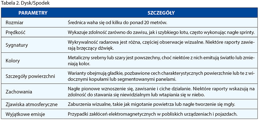 • Dysk lub spodek: UAP w kształcie spodka, z kopułami i bez, były drugim najczęściej zgłaszanym kształtem. Zgłaszano również płaskie spodki, które były obiektami w kształcie dysku bez wyraźnych kopuł. Tradycyjne dwuwypukłe UAP są również zgłaszane w danych.