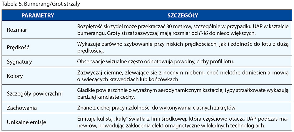 • Bumerang lub grot strzały: UAP w kształcie bumerangu lub grotu strzały były również jednymi z najrzadziej zgłaszanych. UAP w kształcie bumerangu wykazywały dwustronną symetrię, z rozłożystymi skrzydłami i wysokim współczynnikiem kształtu. UAP w kształcie grotu strzały również wykazywały dwustronną symetrię, ale posiadały zwężające się skrzydła i niski współczynnik kształtu, zazwyczaj z mocno zawiniętymi krawędziami natarcia.