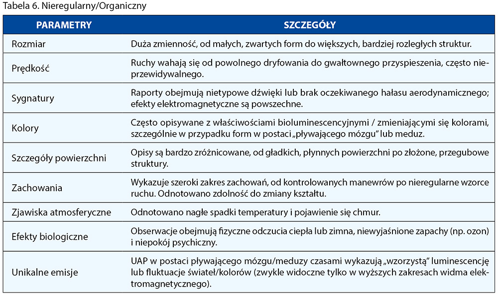• Nieregularne lub organiczne: UAP o nieregularnych kształtach, które wymykają się prostemu opisowi geometrycznemu, były jednymi z najrzadziej zgłaszanych. W zbiorze danych pojawiają się również zmiennokształtne UAP, mające zazwyczaj kulistą lub dyskową „podstawę”, z której wystają nieregularne formy. Obecne są również UAP określane jako „pływające mózgi” lub „meduzy”, charakteryzujące się centralną masą, z której zwisają liczne „ramiona” lub drążki. Zaobserwowano również połączone kształty, w tym sześciany w kulach, pierścieniowe spodki oraz różne formy prostokątne i prostopadłościenne.