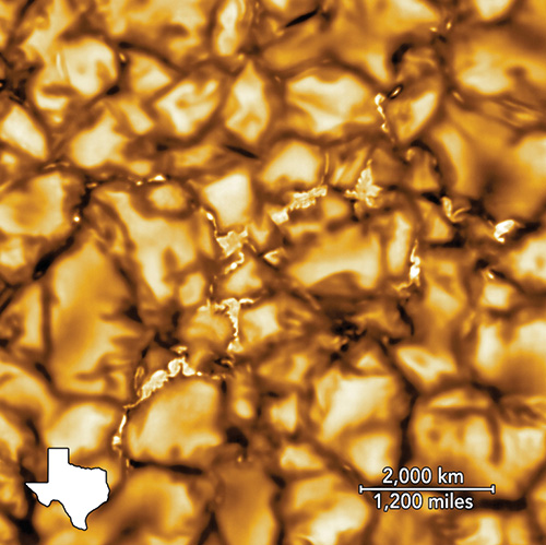 Ryc. 5. Obraz fotosfery w wysokiej rozdzielczości uzyskany za pomocą Teleskopu Słonecznego Daniela K. Inouye. Obecność granulek jest wyraźnie widoczna i przypominają one wyglądem konwekcję Bénarda. „Obraz pokazuje wzór turbulentnego, «wrzącego» gazu, który pokrywa całe Słońce. Struktury przypominające komórki – każda wielkości Teksasu – są sygnaturą gwałtownych ruchów, które transportują ciepło z wnętrza Słońca na jego powierzchnię”.12 (Grafika: NSO/AURA/NSF)
