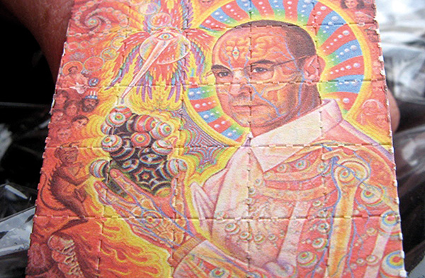 Porcje LSD na tekturkach z wizerunkiem jego odkrywcy, szwajcarskiego chemika Alberta Hoffmana.