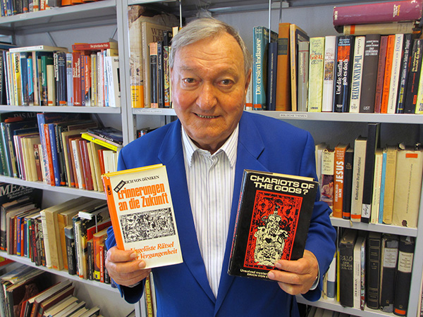 Erich von Däniken z pierwszym wydaniem Erinnerungen an die Zukunft (Wspomnienia z przyszłości) z roku 1968 i jego angielskim przekładem zatytułowanym Chariots of the Gods? (Rydwany bogów)z roku 1969. (Zdjęcie: Prywatne archiwum Ericha von Dänikena)