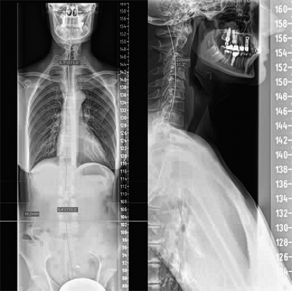 Zdjęcie całości kręgosłupa od przodu oraz odcinka szyjnego kręgosłupa z boku. Zwraca uwagę nieprawidłowe ustawienie w górnym odcinku piersiowym oraz odwrócona krzywizna szyjnego odcinka kręgosłupa. Cienka biała linia przedstawia kształt zdrowego odcinka szyjnego (źródło: Praktyka lekarska dr. Meiera). Po zastosowaniu terapii chiropraktycznej objawy ustąpiły, a ciśnienie krwi spadło do 120/80.