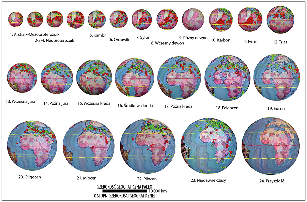 Dane dotyczące starożytnej szerokości geograficznej pokazane są na rycinie 2 na każdym modelu małej Ziemi, od wczesnego archaiku do obecnych czasów. Na tej rycinie dane odnoszące się do szerokości geograficznej mają przypisane kolory. Dane dotyczące północnych i południowych równikowych stref klimatycznych reprezentowane są przez czerwone kropki, północnych i południowych stref umiarkowanych przez zielone kropki, a północnych i południowych regionów polarnych przez niebieskie kropki. Granice stref klimatycznych w postaci przerywanych żółtych linii oparte są na rozkładach strefowych współczesnej Ziemi. Ten rozkład danych dotyczących starożytnej szerokości geograficznej jest przedstawiony w celu uzupełnienia danych o antycznym biegunie magnetycznym i strefach klimatycznych i razem określają ilościowo wykorzystywanie paleomagnetyki do lokalizowania starożytnych biegunów i równików na modelu Ziemi o rosnącym promieniu.