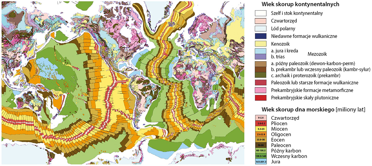 Ryc. 5. Po lewej, zdigitalizowana geologiczna mapa świata (Komisja Geologicznej Mapy Świata i UNESCO, 1990). Po prawej, geologiczna oś czasu przedstawiająca wiek skorup kontynentalnych i dna oceanicznego przedstawionych na rycinie po lewej. Wiek skorup dna morskiego podany jest w milionach lat. (Maxlow, 2018)