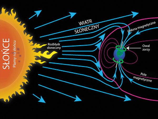 Ryc. 6. Schemat pokazujący, jak wiatr słoneczny oddziałuje na magnetosferę i jak to wpływa na przestrzeń wokółziemską.