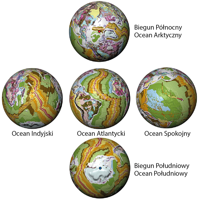 Ryc. 7. Geologiczna mapa świata współczesnego podłoża skalnego przedstawiona w postaci kulistej.