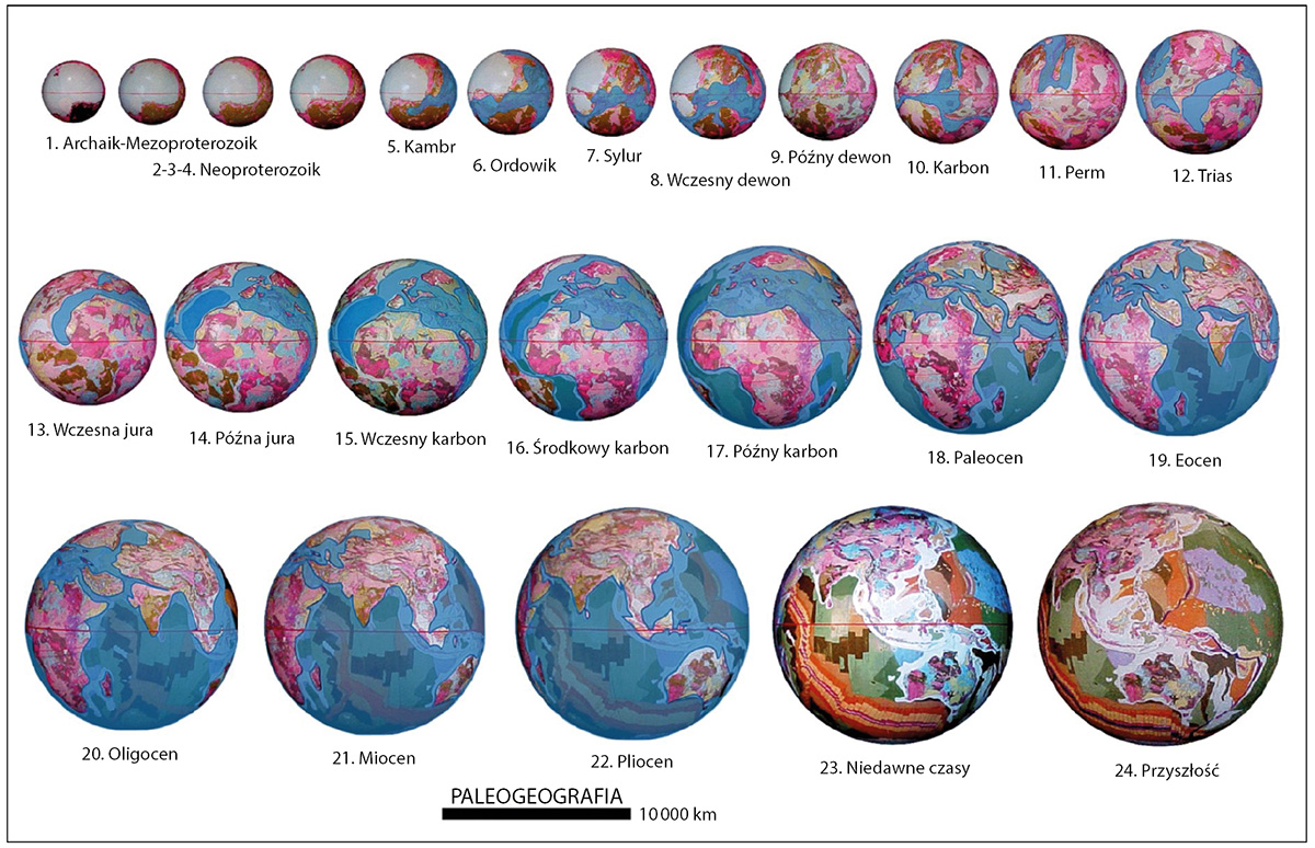 Kontynuując zmniejszanie promienia Ziemi i modelu geologicznego wstecz w czasie do okresu późnego permu – około 250 milionów lat temu – wszystkie młode wulkaniczne skorupy dna morskiego oraz większość osadów morskich leżących wzdłuż półek kontynentalnych zostają usunięte (patrz rycina 3). Rozkład opublikowanych starożytnych mórz kontynentalnych jest także zaznaczony na niebiesko.